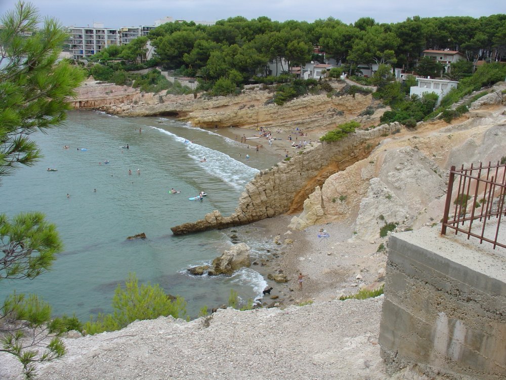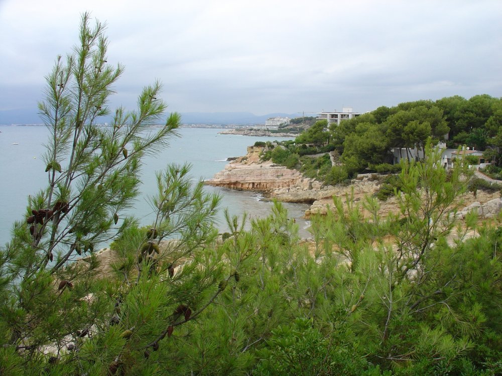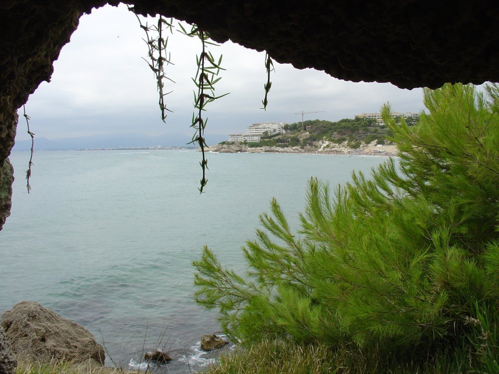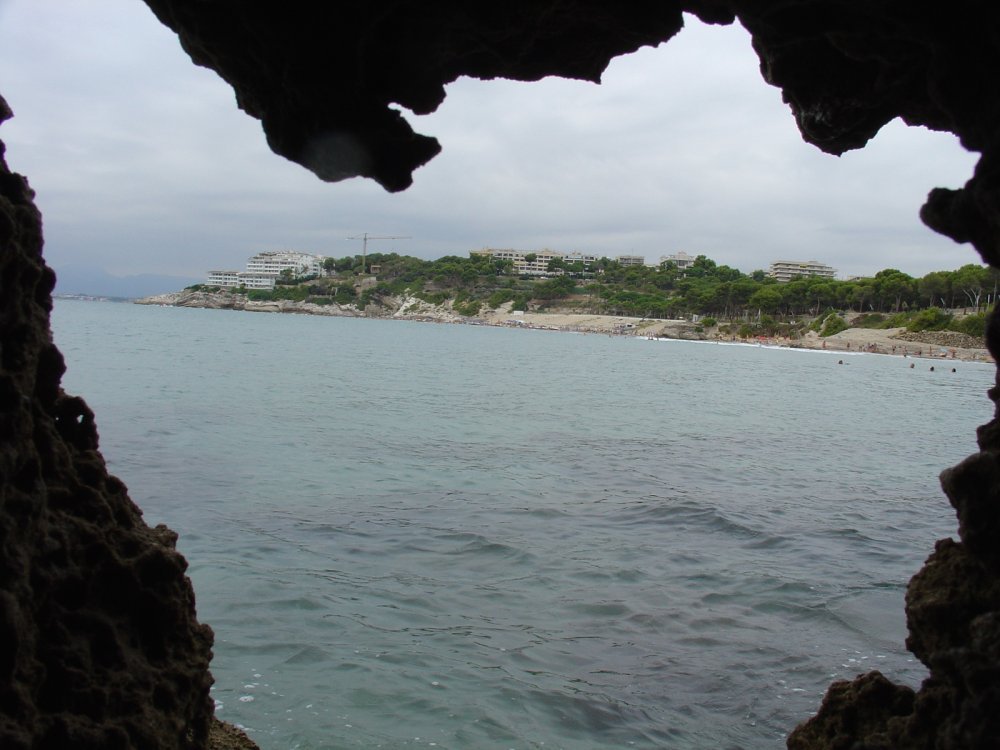 Еще при выборе отеля видел красивую фотографию побережья снятого из грота. Окончательно замучив всех гидов, получил ответ, что если это здесь и есть, то надо идти в сторону La Pineda. Отпарвляюсь на  поиски этого самого грота. Совершив не короткую прогулочку и вдоволь налазившись по прибрежным камням, и естественно не найдя никакого грота, я наконец-то нашел два близкорасположенных камня, просунул руку между ними и сделал кадр очень похожий на то, что видел в журнале. Получилось очень хорошо. Сам бы поверил, что это из грота снято, если бы не знал, как на самом деле это сделано. Чуть-чуть поцарапал фотоаппарат, когда доставал руку обратно. Очень расстроился из-за этого - не переношу замызганных вещей. А потом, подумав, что все равно буду покупать себе профессиональную камеру, уже посмотрел на происшедшее менее критично.