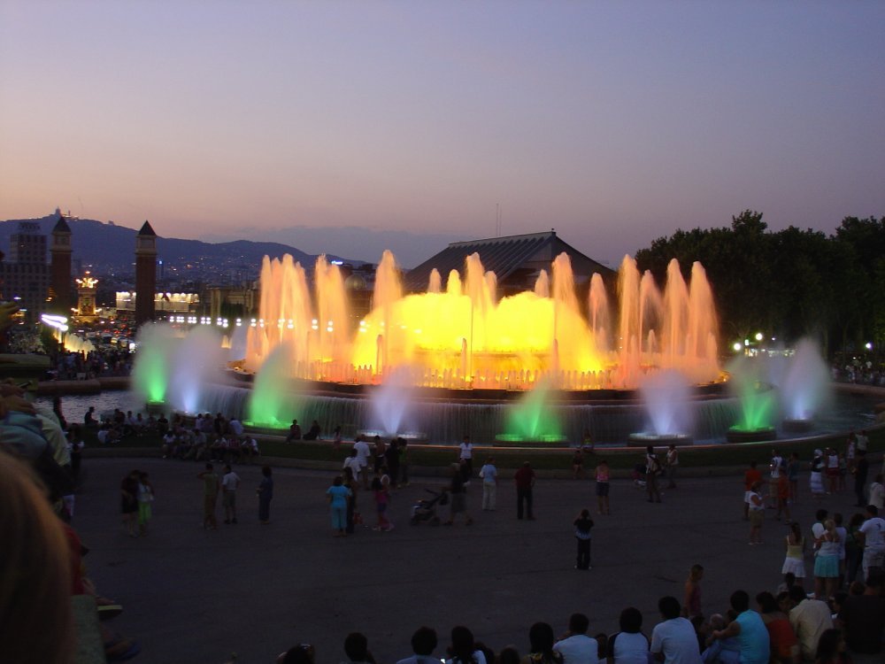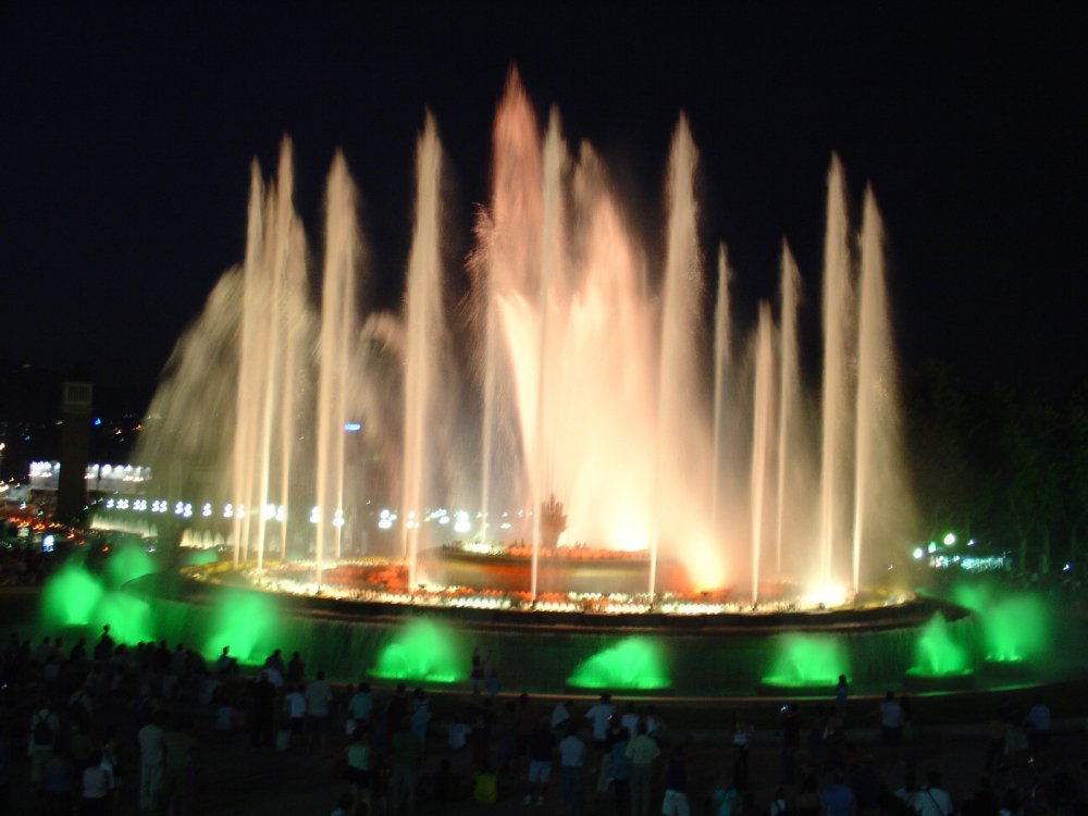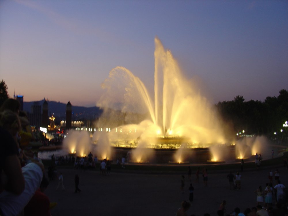 И, наконец, третья часть нашей экскурсии сам фонтан. Когда-то, когда моя мама и тетя смотрели поющие фонтаны в Чехии, то им сказали, что самый хороший фонтан находится в Барселоне, Испания. Гид сообщила, что обычно представление проходит в 2 этапа по 15 минут с перерывом минут в 15. Иногда показывают третью часть. В третьей исполняется гимн Барселоны, и под эту музыку фонтан вытворяет самые невообразимые вещи. Посмотрели выступление фонтана - очень красиво и необычно - я раньше не видел ничего подобного, я даже в Питере ни разу не был. По окончанию второй части все двинулись к своим автобусам, но тут началось третья часть - гимн Барселоны, дуэт Фреди Меркурии и Монсеррат Кабалье. Считаю, что мне очень повезло. Зрелище действительно великолепное. «Невероятное сочетание игры света, воды и музыки». Жаль, что у меня flash-карта для фотоаппарата кончилась.